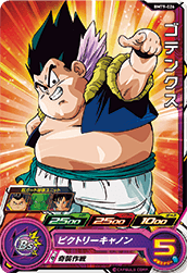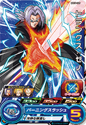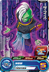 - 第2回合開始時,進入Z模式。輸入成功後,擁有卡片動作技能「Z」的夥伴力量+1500。此外,隊伍攻擊時發動「Z必殺技」,對敵人造成傷害&在發動「Z必殺技」的回合,絕對不會氣絕。[僅限1次]