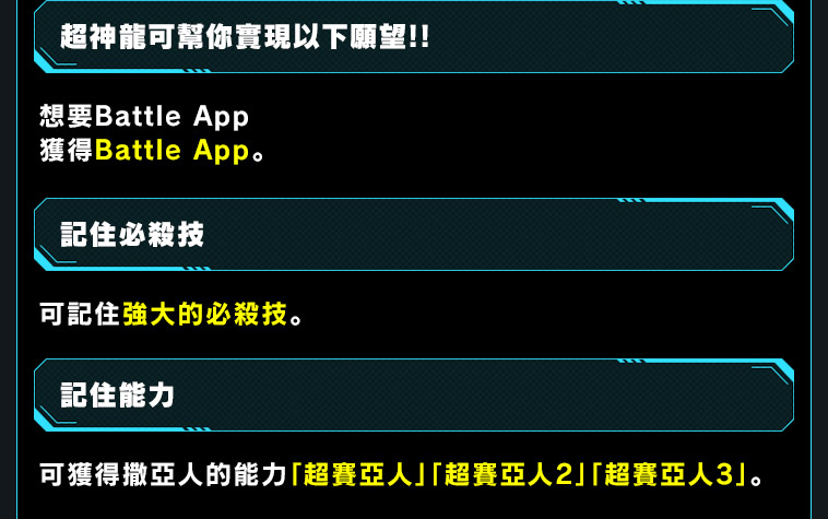 集齊7個超龍珠的話超神龍就會在戰鬥後出現! 超神龍可幫你實現以下願望!! 超神龍可幫你實現以下願望!! 超神龍可幫你實現以下願望!! 超神龍可幫你實現以下願望!! 超神龍可幫你實現以下願望!! 超神龍可幫你實現以下願望!!